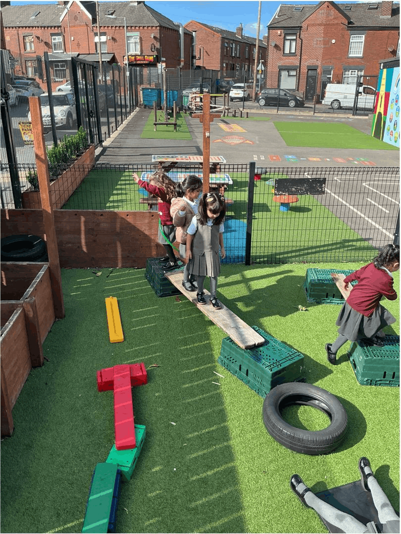 Children develop gross motor skills by running, jumping, climbing, and balancing in both indoor and outdoor spaces. They use equipment such as bikes, balls, climbing frames, and obstacle courses to practise moving in different ways and with increasing confidence. These activities help them explore how their bodies work and move, while developing stamina and resilience.